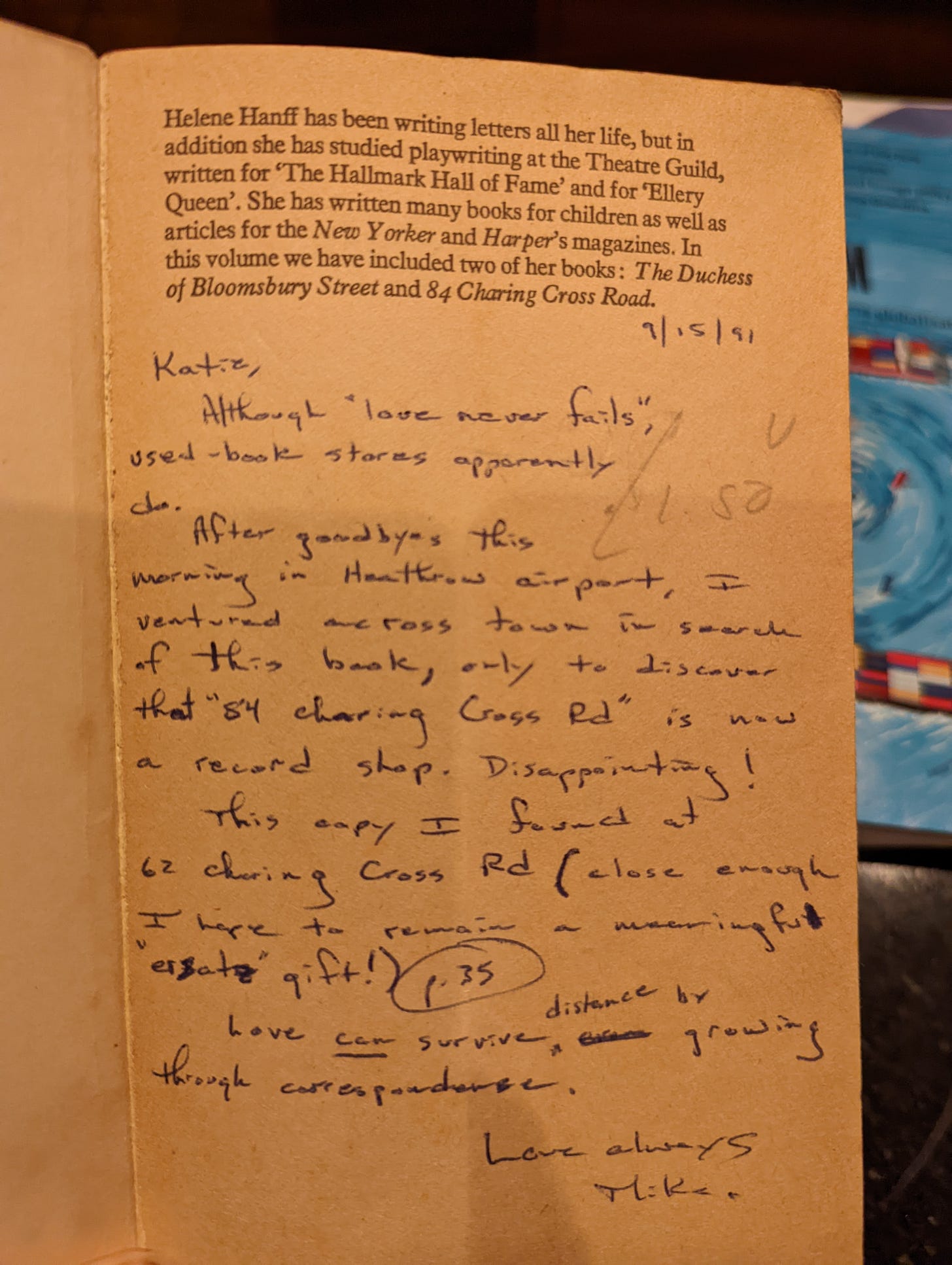 Here’s the inscription from the book 84 Charring Cross Road that Rachel and I reference in our Letters episode. Mine is a used edition and it was really eerie when I opened it and it was directed to Katie! I love the serendipity of things like this.